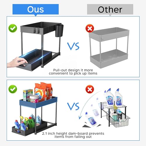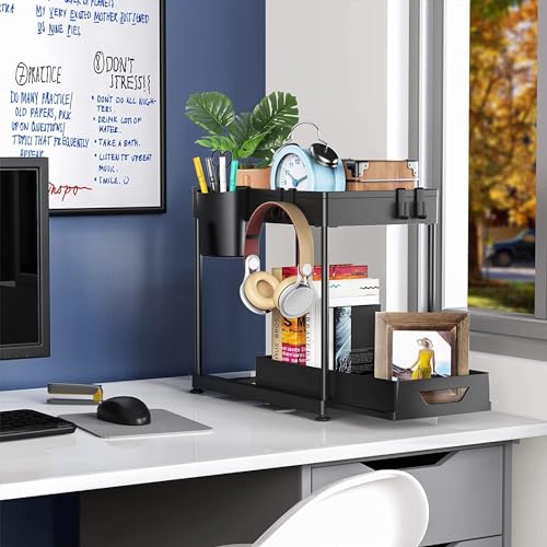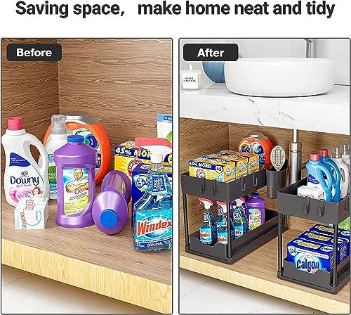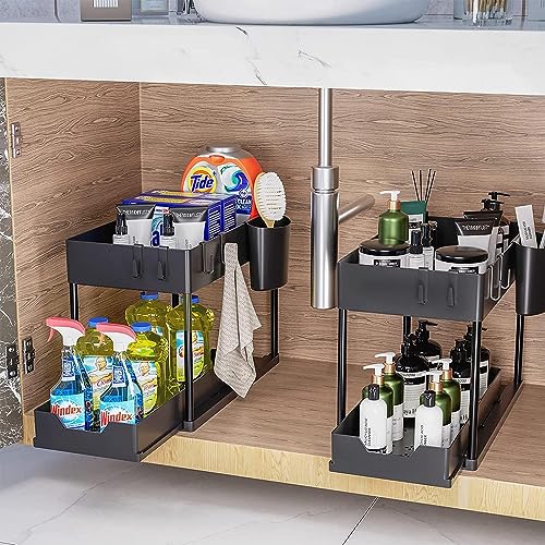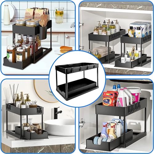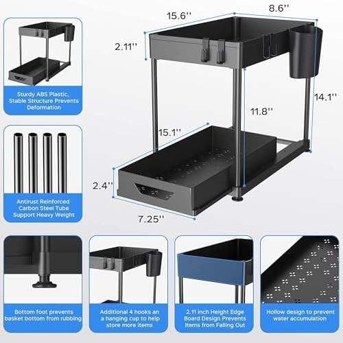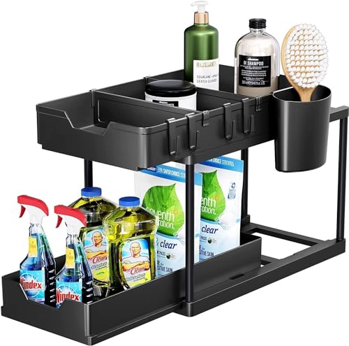 HOOBRO - هوو برو منظم تحت الحوض، منظم درج تخزين منزلق تحت الحمام، منظم ادراج تخزين وتنظيم اكواب وفواصل ومقابض، منظم رف متعدد الاغراض تحت الحوض، اسود، بلاستيك، رف منزلق