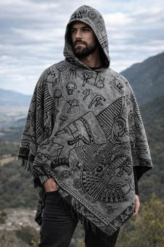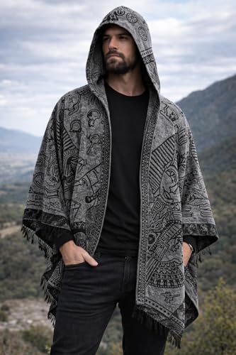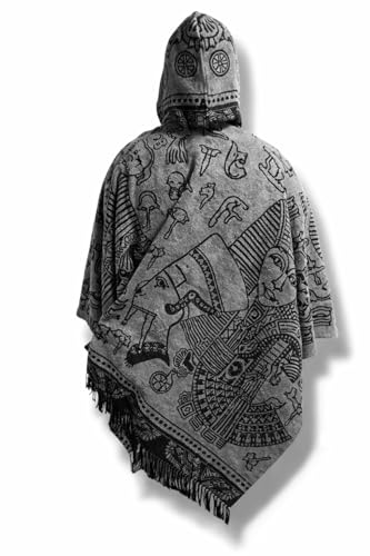 Generic - بونشو بقبعة مع تصميم مصري، عباءة شال مفتوحة بشراشيب للرجال والنساء، رمادي