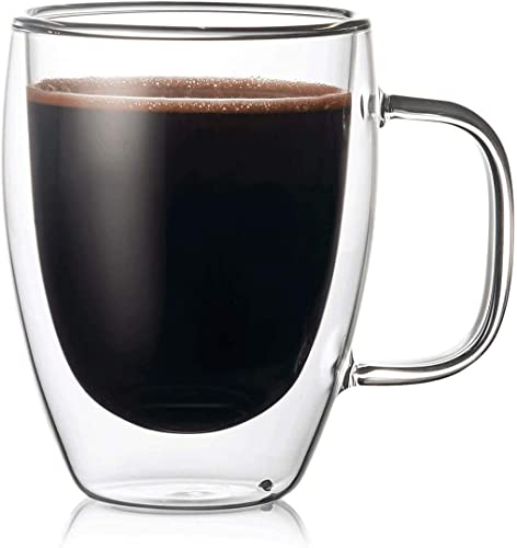 Hooipo - اكواب قهوة زجاجية مزدوجة الجدران مع مقبض من هويبو، اكواب قهوة بطبقة معزولة من زجاج البوروسيليكات الشفاف للكابتشينو والشاي واللاتيه والاسبريسو والمشروبات الساخنة والباردة (عبوة من قطعة واحدة)
