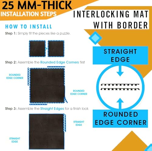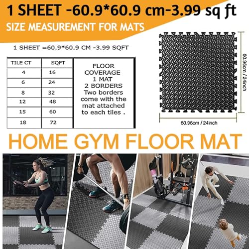 - 【مادة سجادة أرضية تمارين الأحجية】– سجادات مطاطية رغوية، اللون - أسود ورمادي وأسود مع رمادي مقاس 60.9×60.9 سم - 0.3 متر مربع. تحتوي كل سجادة أرضية لصالة الألعاب الرياضية على حافتين. سجادة أحجية Ex-4 =>1.4 متر مربع السُمك -25 ملم => 2.5 سم، سجادة إسفنجية لصالة الألعاب الرياضية واليوجا للأطفال.