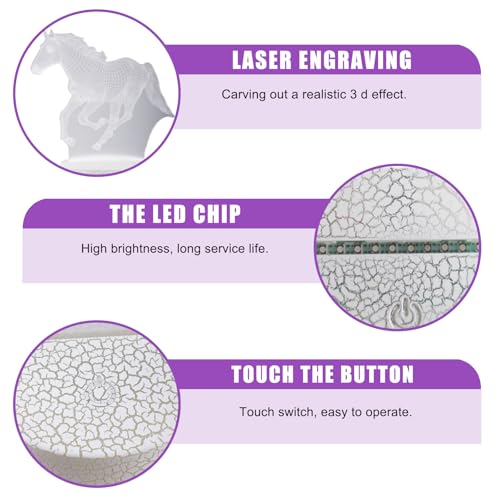 - تأثير بصري ثلاثي الأبعاد: بفضل التكنولوجيا البصرية وألواح الأكريليك ثنائية الأبعاد المحفورة بالليزر، يقدم ضوء الحصان الليلي صورة حصان ثلاثية الأبعاد واقعية ويمنح غرف النوم وغرف الأطفال تأثيرًا زخرفيًا فريدًا. هذا التأثير البصري المبتكر يجعله الهدية المثالية للأشخاص من جميع الأعمار، وخاصة محبي الخيول
