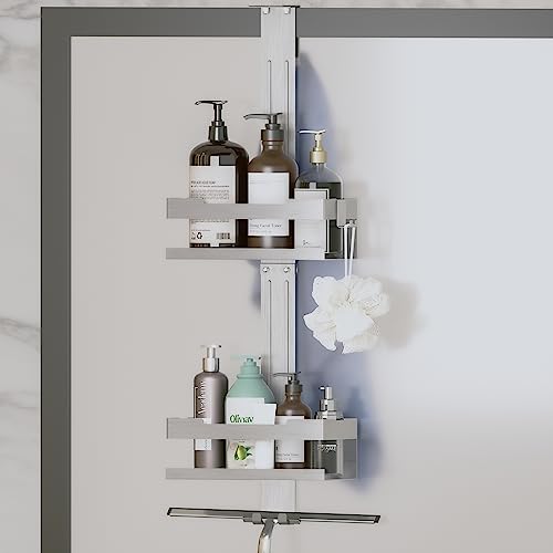 Hosanwell - هوسانويل رف دش للتعليق بدون ثقب مزدوج الطبقات مصنوع من الستانلس ستيل SUS304 حامل شامبو للاستحمام للباب الزجاجي حفر مع 4 خطافات فضي