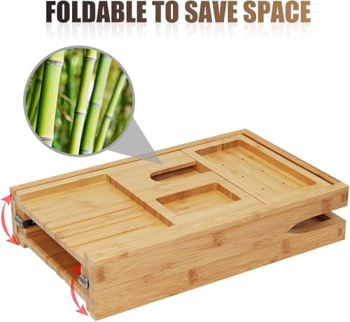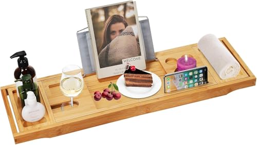 Hossejoy - هوس جوي صينية حوض الاستحمام من الخيزران قابلة للطي، صينية تنظيم ارفف الدش بجوانب ممتدة مدمجة للكتب والتابلت وحامل زجاج نبيذ مدمج وصينية للجوال ووضع الملحقات