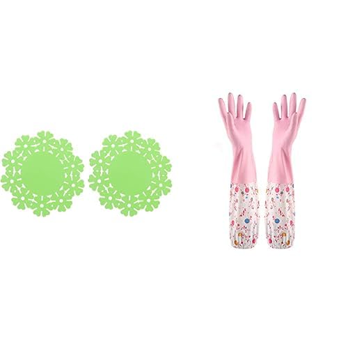 Generic - مجموعة قاعدة أكواب سيليكون للأطباق والأكواب الساخنة + جوانتي مطاط من اللاتكس للتنظيف والأعمال المنزلية مع بطانة قطيفة، جوانتي طويلة عازلة للماء لغسل الأطباق (وردي)