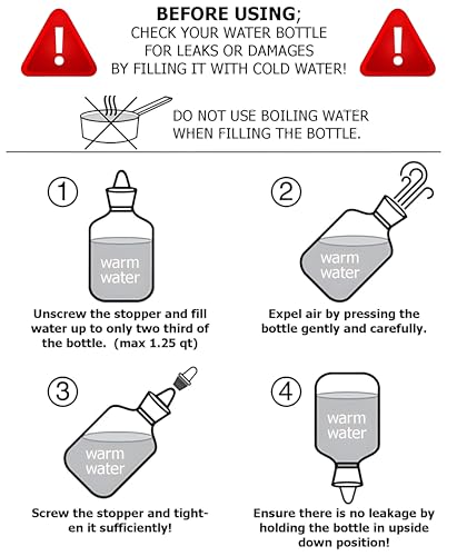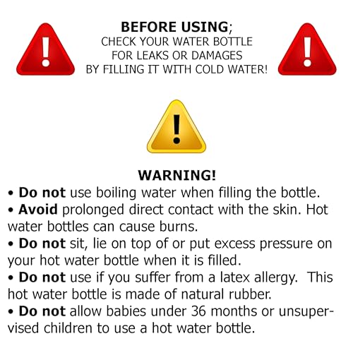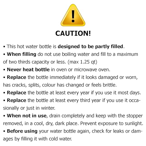 - لتقليل أي رائحة مطاطية أولية، يُنصح بنقع زجاجة المياه الساخنة في خليط الخل والماء لمدة 30 د على الأقل قبل الاستخدام الأول. يمكن لهذه الخطوة البسيطة أن تُعزز تجربتك عن طريق تقليل أي روائح كريهة مرتبطة بالمطاط الطبيعي. يبلغ مقاس الزجاجة 35.5 × 18 سم، في حين أن الحاوية نفسها 25 × 18 سم، مما يجعلها صغيرة الحجم بما يكفي لسهولة التخزين ولكنها كبيرة بما يكفي لتوفير علاج حراري كبير عند الحاجة.