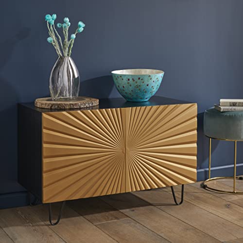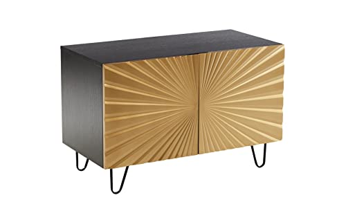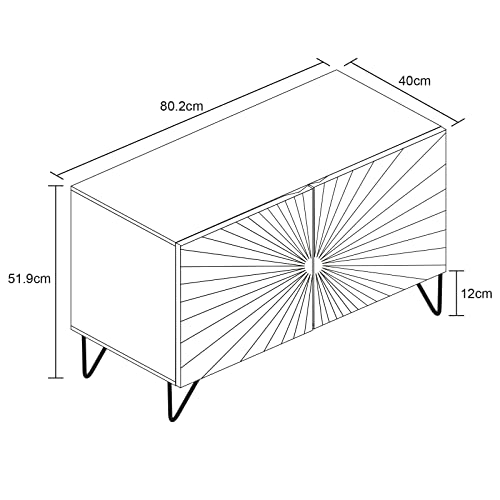 - وحدة تخزين جانبية من صن برست: خزانة خشبية أنيقة للغاية ذات تأثير معدني مع أرفف بالداخل، بشكل مستطيل مع خط مخدد نصف قطري مصمم من الأمام وأرجل معدنية على شكل حرف U