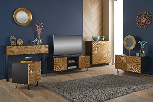 - تصميم مستوحى من فن الديكو: أسود من الداخل والداخل، مع واجهة من خشب ليفي متوسط الكثافة مطلية بالذهب المذهل. طاولة جانبية مميزة أو خزانة تخزين أحذية ستكون نقطة محورية في أي غرفة