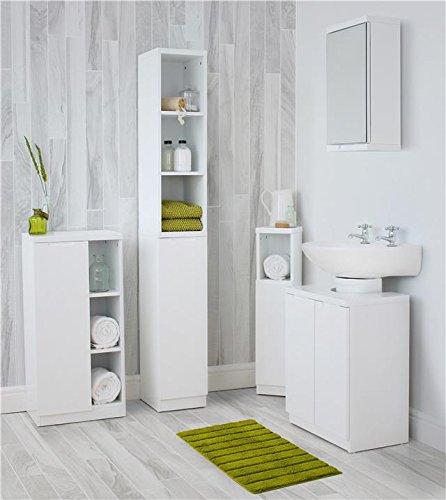 - وحدة تخزين تحت الحوض: أنشئ مساحة تخزين فورية تحت حوض الغسيل الخاص بك مع خزانة الحمام الأنيقة ذات اللون الأبيض اللامع، والمصممة لتوضع على الأرض.