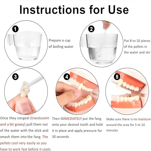 - تصميم سهل الاستخدام: سخن خرزات اللاصق حتى تتحول من اللون الأبيض إلى الشفاف (يكفي استخدام ماء ساخن)، ثم أخرجها واضغطها على الأسنان لتشكيل القالب، وبعدها ضع طقم الأسنان المناسب فوق اللاصق واضغط عليه قليلًا. (تذكّر أن الخرزات تبرد سريعًا، لذا يجب إنجاز الخطوات بسرعة).