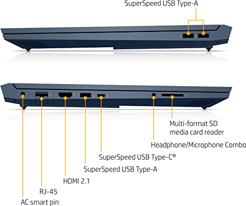 - المنافذ: 1 منفذ USB نوع C بمعدل إشارة 5 جيجابت في الثانية، (منفذ شاشة عرض 1.4، تقنية الشحن أثناء وضع السكون اتش بي) 1 منفذ USB نوع A بمعدل إشارة 5 جيجابت في الثانية (تقنية اتش بي للشحن أثناء وضع السكون)، 1 منفذ USB نوع A بمعدل إشارة 5 جيجابت في الثانية، 1 دبوس تيار متردد ذكي، 1 منفذ HDMI 2.1 و1 منفذ كومبو لسماعة الرأس/الميكروفون و1 منفذ ار جيه-45