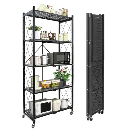 HPONQIONE - رفوف تخزين معدنية قابلة للطي من 5 طبقات شديدة التحمل من اتش بونكيون، 28 انش عرض × 14 انش عمق × 65 انش ارتفاع لخزانة المطبخ والخبازين، سلك معدني، مع عجلات تتحرك بسهولة