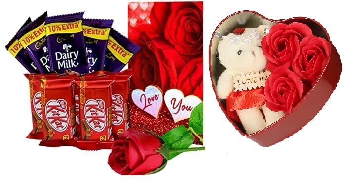 - تحتوي عبوة المبيعات على: 5 (INR 10/-) 5x10 شوكولاتة كادبوري ديري ميلك، 5 شوكولاتة كيت كات (INR 10/-) وبطاقة تهنئة الحب بحجم 18 × 12، 1 وردة حمراء صناعية، 1 صندوق على شكل قلب مع تيدي.