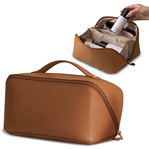 Hrwxear - حقيبة مستحضرات تجميل للسفر بسعة كبيرة للنساء من جلد البولي يوريثين المقاوم للماء والحمام والتخزين لون بني