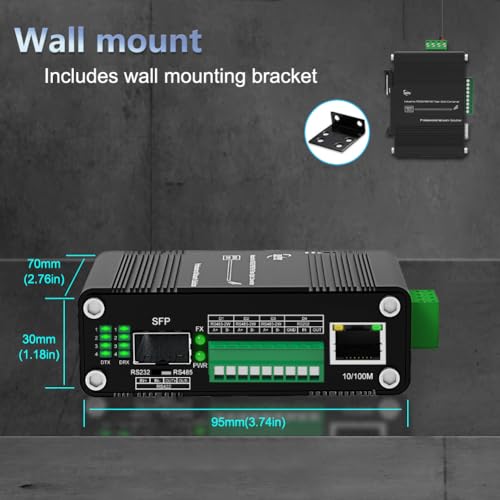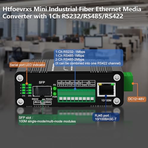 Htfoevrxs - محول وسائط الياف صناعية RS232/RS485/RS422 الى ايثرنت 10/100Base-T الى 100Base-X SFP من اتش تي اف او اي في ار اكس بقضيب DIN/يثبت على الحائط، مدخل واسع 12-48 فولت تيار مستمر، -40 درجة مئوية ~75 درجة