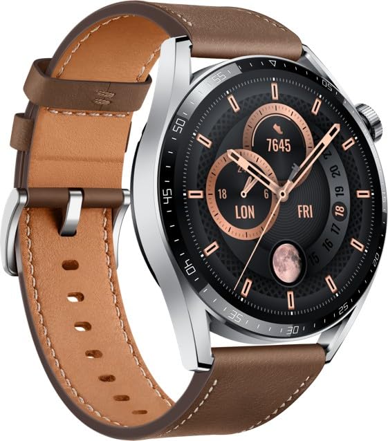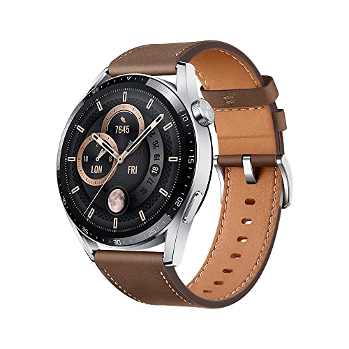 HUAWEI - ساعة هواوي GT3 46 ملم، هيكل من الستانلس ستيل وسوار من الجلد البني