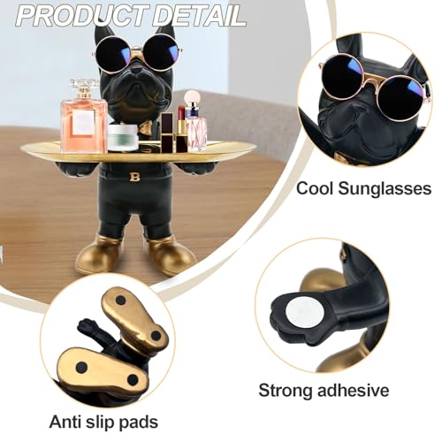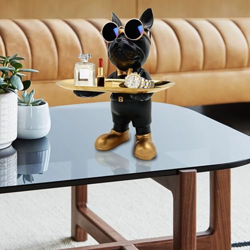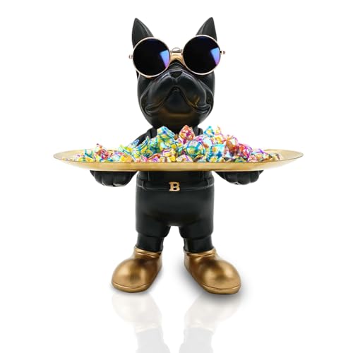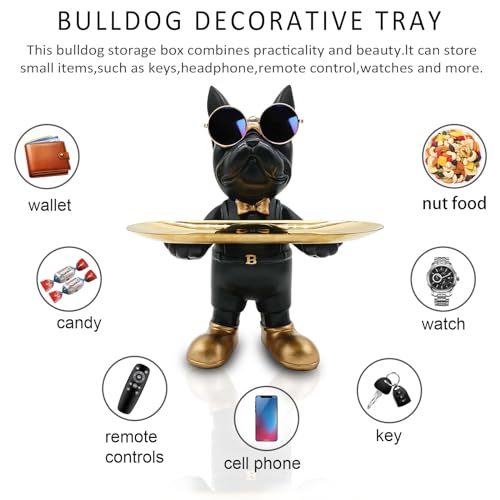 Huhote - تمثال بتصميم كلب البلدوج واقف من الراتنج مع صينية مناسب كوعاء لحمل المفاتيح أو الحلوى، اكسسوار تمثال البلدوج من الراتنج لتزيين مكاتب العمل وطاولات المدخل من هوهوت، أسود