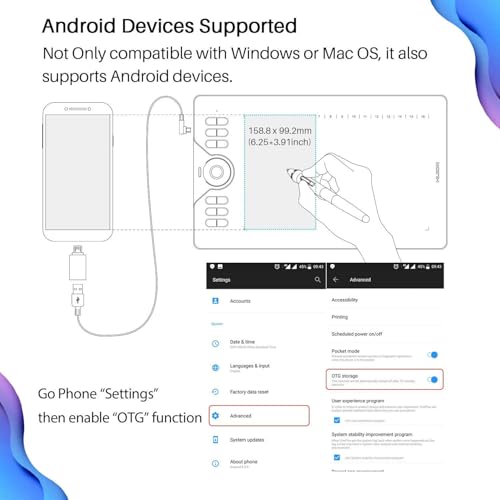 - يدعم نظام التشغيل اندرويد: HS610 من هيون متوافق مع نظام التشغيل اندرويد 6.0 أو الأحدث. يمكنك بسهولة توصيل أجهزة الاندرويد بلوحة الرسم مع محول او تي جي. يتميز HS610 بسمك 8 ملم ووزن 600 جرام خفيف الوزن وسهل الحمل، مما يجعله شريكاً رائعاً للرسم في أي وقت وفي أي مكان مع موبايلك