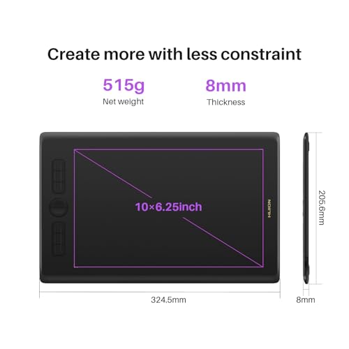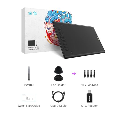HUION - تابلت رسم هيون انسبايروي H610X مقاس 10×6.25 بوصة يدعم نظام كروم بوك واندرويد بدون بطارية، يأتي معه قلم ستايلس 8192 بحاسية الضغط و8 مفاتيح اكسبرس، تابلت للمنزل والمكتب والتعليم في المنزل
