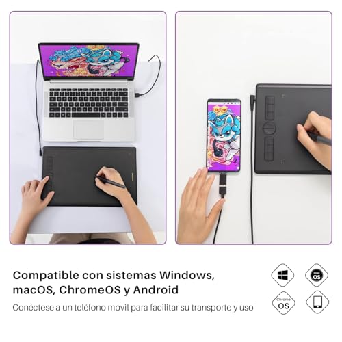 - دعم كروم بوك - يتوافق تابلت الرسم هيون H610X مع ماك (او اس 10.12 وما أعلى) وويندوز 7 وما أعلى وكروم بوك (يدعم أحدث نسخة من كروم او اس 88 وما أعلى) وأجهزة الاندرويد (او اس 6.0 وما أعلى). يمكنك توصيل هاتفك بسهولة بالتابلت باستخدام وصلة او تي جي، أجهزة الموبايل والتابلت التي تدعم نظام اندرويد 6.0 فما فوق فقط، بينما الايفون والايباد لا يمكن استخدامهم مع التابلت في الوقت الحالي. ملاحظة: لن يظهر المؤشر في أجهزة سامسونج في الوقت الحالي، باستثناء سلسلة سامسونج نوت.