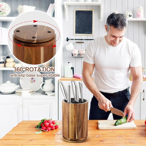 - حامل سكاكين خشبي دوار 360 درجة: يدور حامل السكاكين الخشبي هذا بسلاسة لسهولة الوصول إلى جميع سكاكينك؛ تتميز القاعدة بتصميم وسادة مضادة للانزلاق لجعل الدوران أكثر استقرارًا ومنع الانزلاق والانقلاب؛ الغطاء البلاستيكي الأسود المتضمن (قطر 13 سم) يحافظ على السكاكين بعيدًا عن الغبار عند عدم الاستخدام