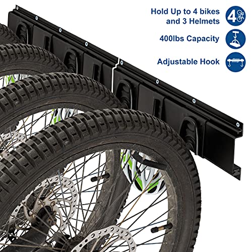 Hutigertech - رف تخزين الدراجة يثبت على الحائط للمراب لـ 4 دراجات + 3 خوذ، خطافات تخزين ادوات شديدة التحمل قابلة للتعديل موفرة للمساحة المنزلية، تحمل حتى 400 باوند