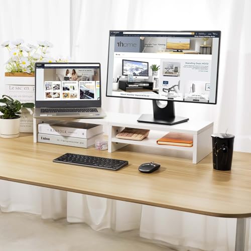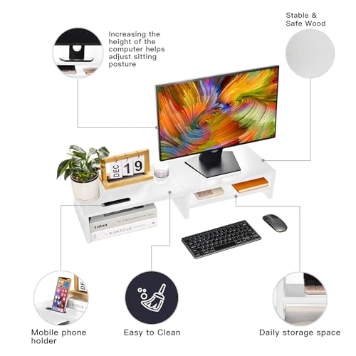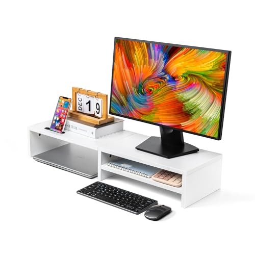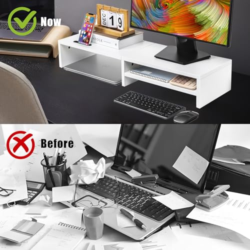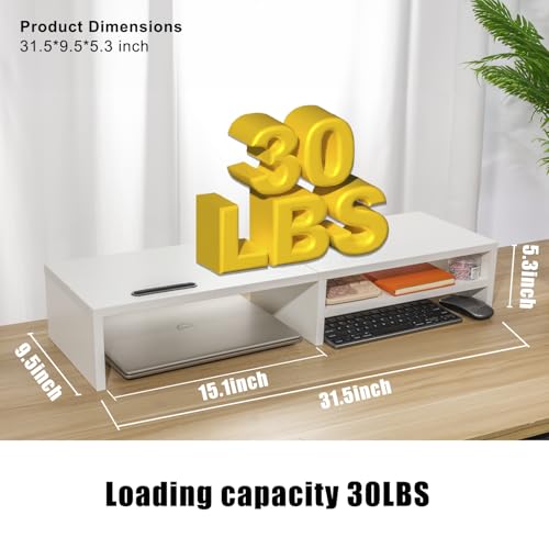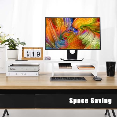 HUVIBE - حامل شاشة، حامل خشبي من طبقتين مع منظم تخزين، حامل شاشة سطح المكتب مع منظم تخزين للمنزل والمكتب، 31.5 انش (ابيض)