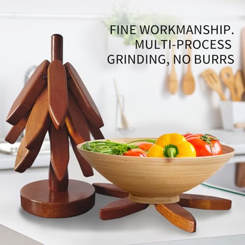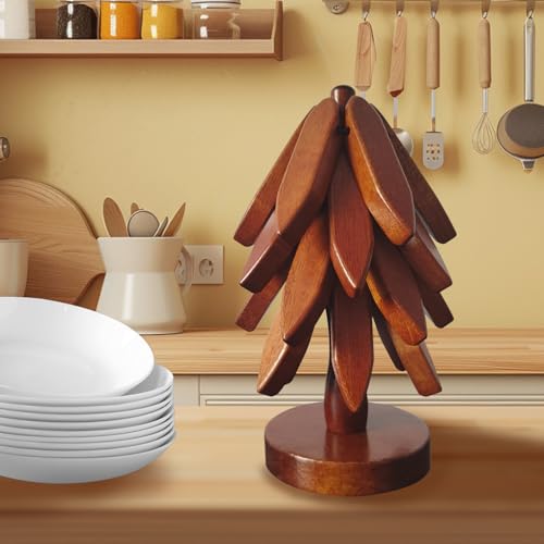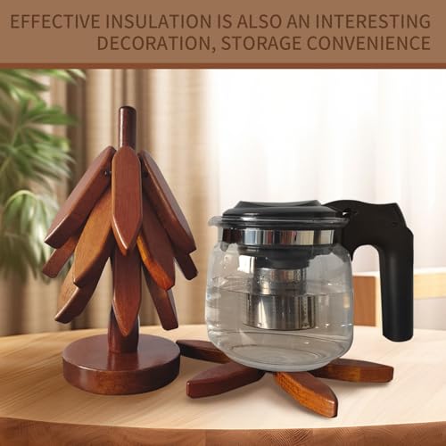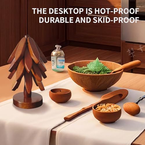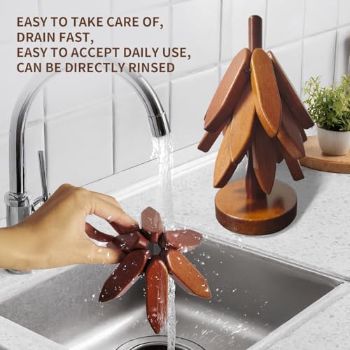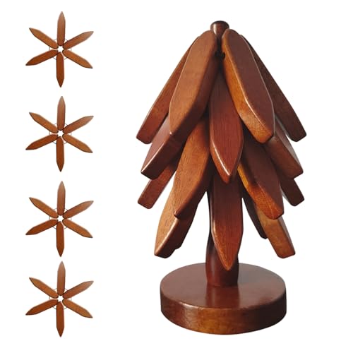 HxQinbe - حامل خشبي للأطباق الساخنة من اتش اكس كينبي، قاعدة أكواب خشبية ثلاثية القوائم، مجموعة حوامل على شكل شجرة - 4 حوامل خشبية + 1 حامل تخزن مثل شجرة الكريسماس