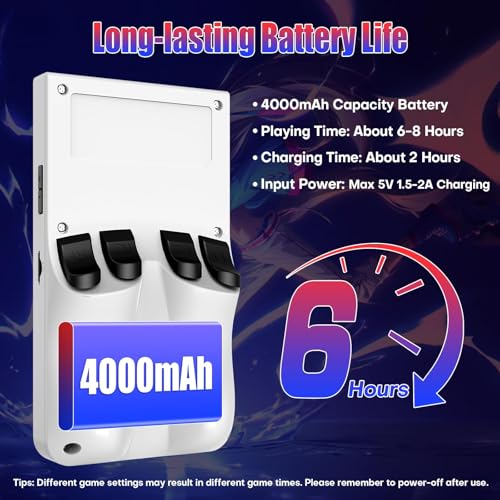 - تصميم قابل للحمل مع بطارية 4000mAh: جهاز تشغيل العاب الفيديو الرقمية الكلاسيك هذا صغير الحجم وخفيف الوزن. مع بطارية قابلة لإعادة الشحن بسعة كبيرة 4000mAh توفر مدة تشغيل بطارية تصل إلى 6 ساعات، مما يسمح للاعبين بالاستمتاع بالألعاب في أي مكان وفي أي وقت. يجلب لك الكثير من المرح والسعادة خلال الرحلة القصيرة أو الرحلة الطويلة.