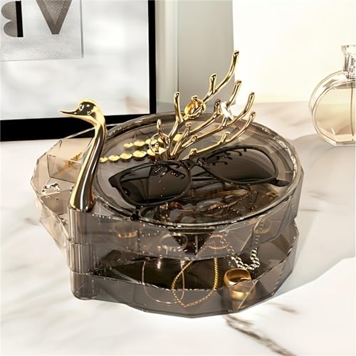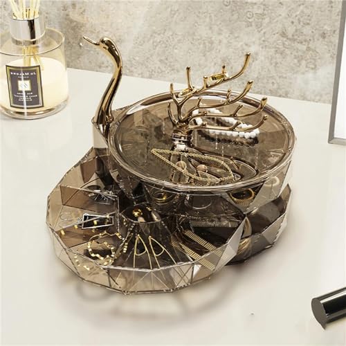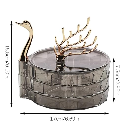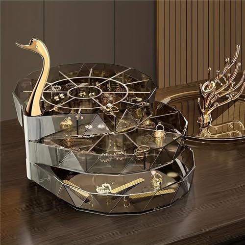 HYTTER - صندوق تخزين مجوهرات دوار من 3 طبقات من هيتر، حافظة مجوهرات على شكل قلب مع رف تعليق مجوهرات على شكل شجرة، حامل عرض مجوهرات فاخر - بلاستيك أكريليك، شبه شفاف مرئي (أسود، بجعة)