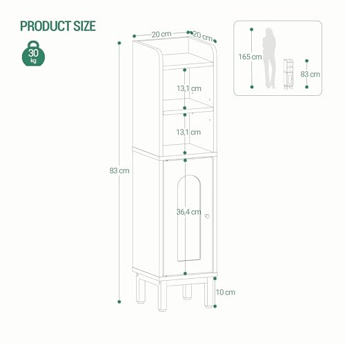 - مناسبة للمساحات الضيقة: دواليب الحمام الأنيقة والموفرة للمساحة هذه، بأبعادها البالغة 20 × 20 × 84 سم، تتناسب تمامًا مع الزوايا والمساحات الضيقة. يضيف تصميم الباب المقوس والأرجل الذهبية الأربعة لمسة جمالية أنيقة إلى حمامك.