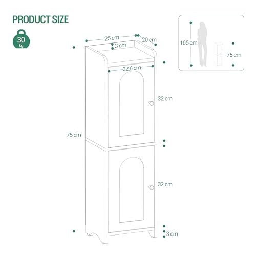 - [مناسبة للمساحات الضيقة] خزانة الحمام الأنيقة الموفرة للمساحة مثالية للمساحات الضيقة مقاس 20 × 25 × 75 سم، كما أن تصميم الباب المنحني الأنيق يمنح حمامك لمسة جمالية