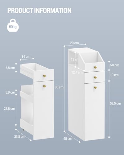 Hzuaneri - خزانة حمام صغيرة BC22003X من هزوانيري، خزانة صغيرة ضيقة لورق المرحاض مع ادراج مع درج على عجلات 40 × 20 × 80 سم، ابيض
