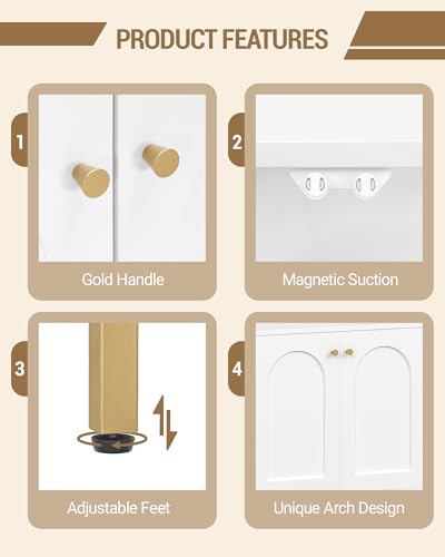 - تصميم فريد: اللون الأبيض الكلاسيكي والتصميم البسيط والأبواب المقوسة الفريدة وأقدام الخزانة الذهبية تجعل خزانة الحمام هذه إضافة عصرية لأي غرفة، سواء كانت الحمام أو غرفة المعيشة أو منطقة المدخل.