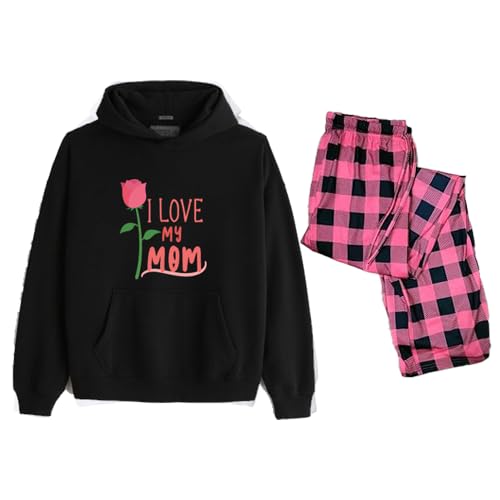 Generic - طقم هودي وسروال بيجامة مطبوع عليه I Love My Mom، هودي اسود مع بنطلون منقوش باللون الزهري، قطعتين موضوع عيد الام (3XL)