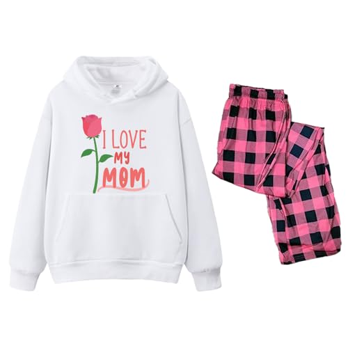 Generic - طقم سويت شيرت بغطاء للرأس بلون أبيض مطبوع عليه (I Love My Mom) وبنطلون بيجامة بتصميم كاروهات بلون وردي، قطعتين بتصميم عيد الام، مقاس سمول (S)