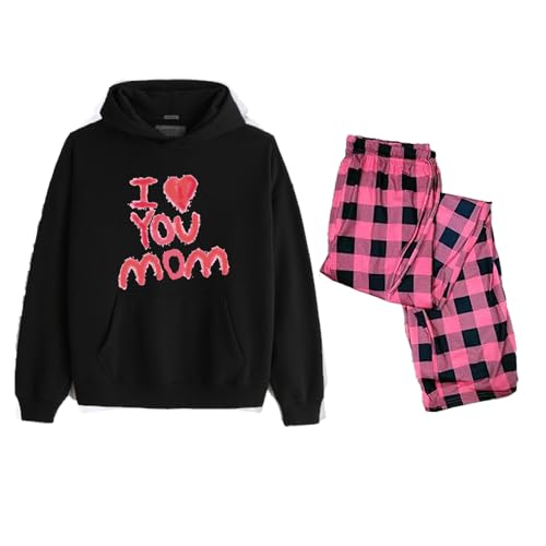 Generic - طقم بيجاما بغطاء للرأس مطبوع عليه عبارة I Love You Mom مع بنطلون بينك، قطعتين مقاس (لارج)