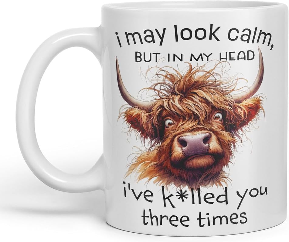 Generic - كوب ملون من السيراميك بطبعة عبارة «I May Look Calm, but in My Head I've k*lled You Three Times Highland Cow Joke sarkasm» الساخر للشاي والقهوة والمشروبات الساخنة، أبيض