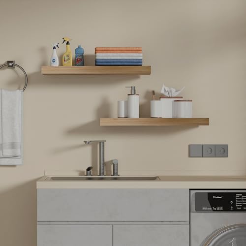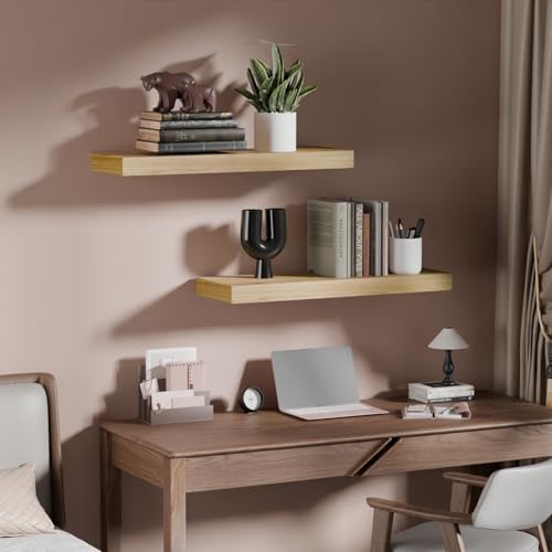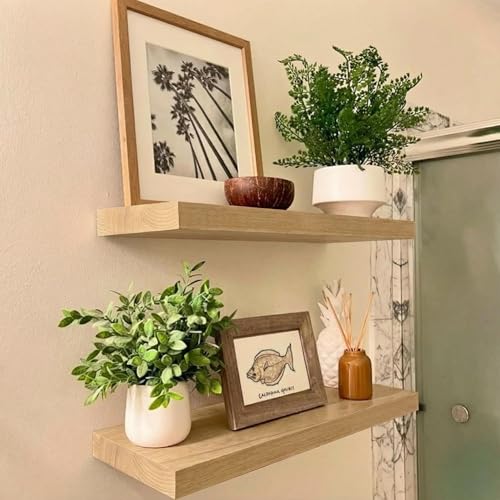 IAE - أرفف حائط عائمة، أرفف حمام مثبتة على الحائط بدعامات غير مرئية، أرفف مطبخ عائمة، أرفف حائط خشبية مع دعامات سهلة التركيب لغرفة المعيشة مثبتة على الحائط من IAE، مجموعة من قطعتين، لون البلوط (Oak)