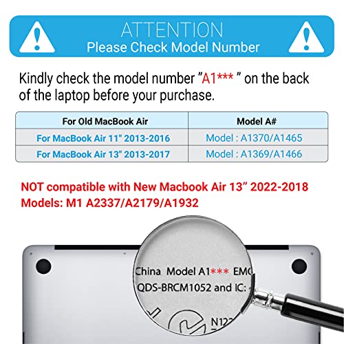 - تحقق من موديل جهازك: تم تصميم هذا الجراب خصيصًا لجهاز ماك بوك اير 11 بوصة الذي تم إصداره في 2016 و2015 و2013 و2012 وأواخر 2010؛ الموديلات: A1465 A1370; MJVM2LL/A، MJVP2LL/A، MC505LL/A، MC506LL/A، MC968LL/A، MC969LL/A، MD223LL/A، MD224LL/A، MD711LL/A، MD712LL/A.