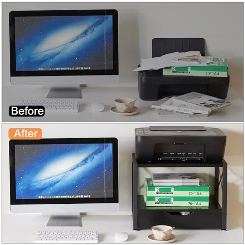 - 【تصميم موفر للمساحة】حامل الطابعة المكون من طبقتين مع درج تخزين موفر للمساحة بشكل واضح، مما يجعله مثاليًا للمكاتب الصغيرة ومساحات العمل المنزلية، ويمكن أن يوفر لك مساحة تخزين أكبر. يحتوي حامل الطابعة الخاص بنا على درج يعمل بالدفع والسحب يمكنه حمل الأدوات المكتبية وبعض المستندات والنوت بوك وترتيب كل شيء!