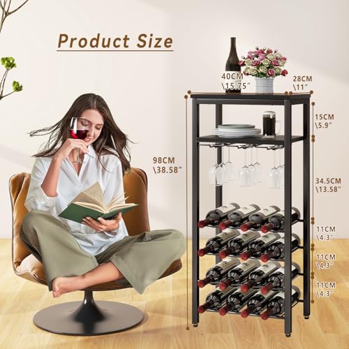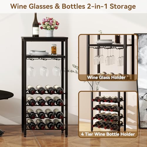 IBUYKE - ايبويك رفوف مشروبات قائمة بذاتها، حامل زجاجة المشروبات الكحولية، 16 زجاجة مع حامل زجاج، عرض حامل النبيذ، طاولة بار النبيذ الصغيرة لغرفة المعيشة، المطبخ، غرفة الطعام، اسود TMJ907B