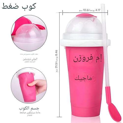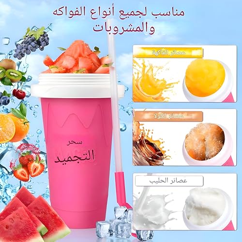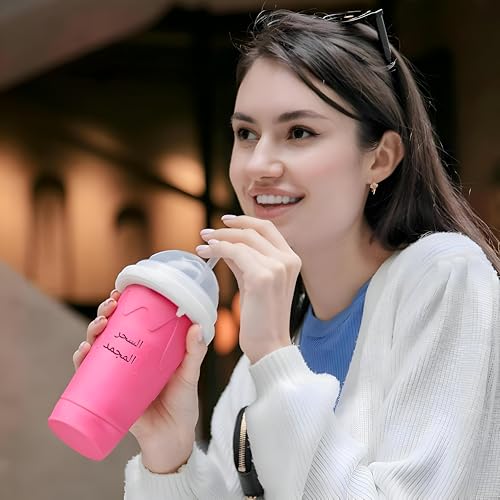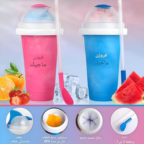 - يتميز كوب السلاش والميلك شيك كبير الحجم بأنّه مصنوع من مواد متعددة الاستخدامات ومتينة بما في ذلك السيليكون ومادة ايفا والبولي بروبيلين، مما يضمن إمكانية تعزيز السلامة أثناء استخدام المنتج مع الطعام مع الحفاظ على الملمس الناعم والتصميم القوي المناسب لجميع المشروبات المجمدة المفضلة.