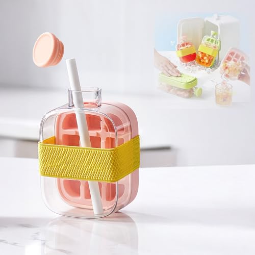 Twinsun - زجاجة مياه بمكعبات ثلج 2 في 1 مع شفاطة، زجاجة مياه وصينية مكعبات ثلج مع غطاء وحاوية، زجاجة صنع مكعبات الثلج للمنزل والمكتب في الهواء الطلق وصنع الثلج والقهوة المثلجة والعصير والمشروبات بلون وردي 500