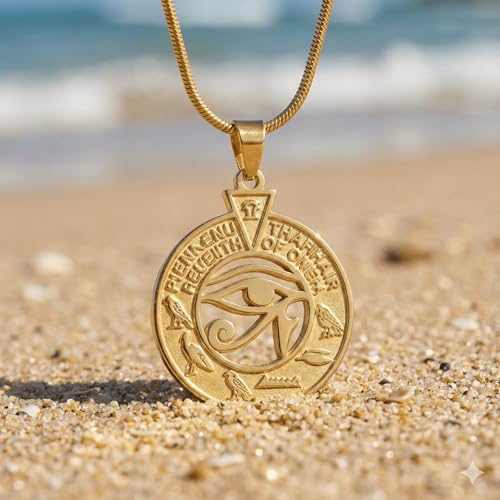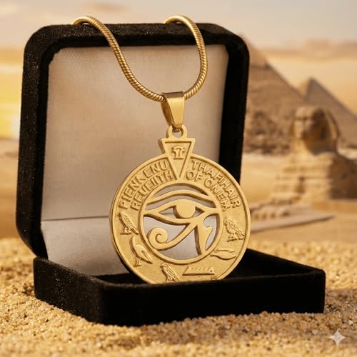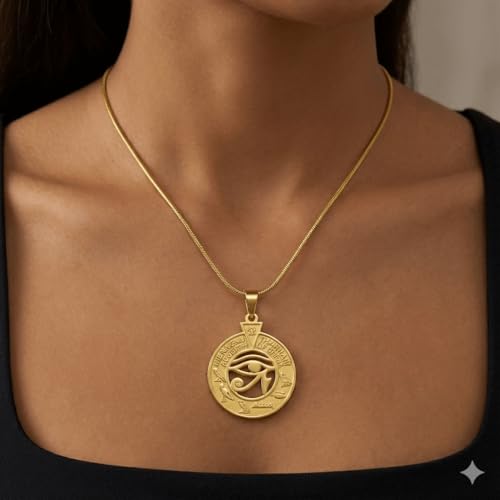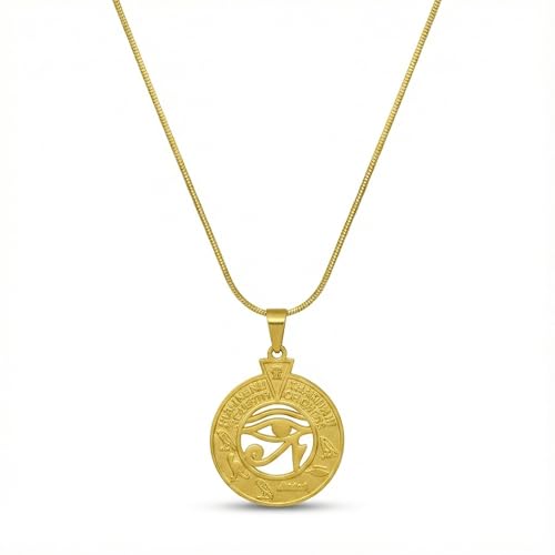 Generic - سلسلة عين حورس الفرعونية الأيقونية | بتصميم دائري مع كتابة هيروغليفية مطلية ذهب عيار 18 قيراط | دلاية رمز الحماية والصحة | مجوهرات للجنسين بتصميم مصري أصيل | من الاستانلس ستيل المقاوم للصدأ والبهتان