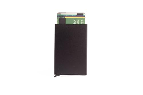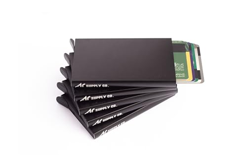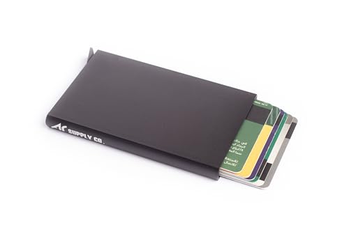 Ar Supply - حامل كروت معدن بخاصية حجب تقنية تحديد الهوية بموجات الراديو مع آلية منبثقة للوصول السريع - محفظة ألومنيوم رفيعة بتصميم بسيط وصلب آمنة لبطاقات الائتمان وبطاقة الهوية (لون أسود)