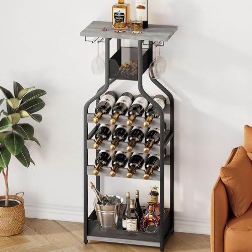 IDEALHOUSE - رف حامل لزجاجات العصير المعدنية القائمة بذاتها للارضية من ايدل هاوس، منظم صغير للمنضدة لتنظيم تخزين العصير مع حامل للكؤوس وطاولة علوية خشبية للبار والمطبخ وغرفة الطعام وغرفة المعيشة (رمادي)