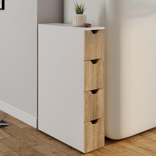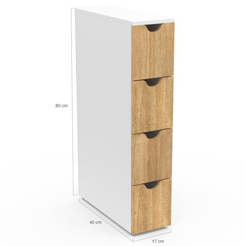 - وحدة تخزين متعددة الأغراض موفرة للمساحة مع 4 أدراج على عجلات بيضاء ومظهر من خشب الزان