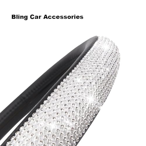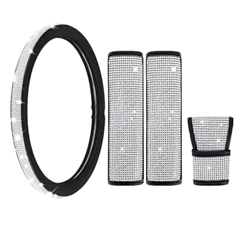 iEago RC - مجموعة اكسسوارات السيارة المرصعة بالكريستال تتضمن غطاء لامع لمقود السيارة واغطية لحزام الامان وغطاء جلد لفرامل اليد للنساء من اي ايجو ار سي، 4 قطع