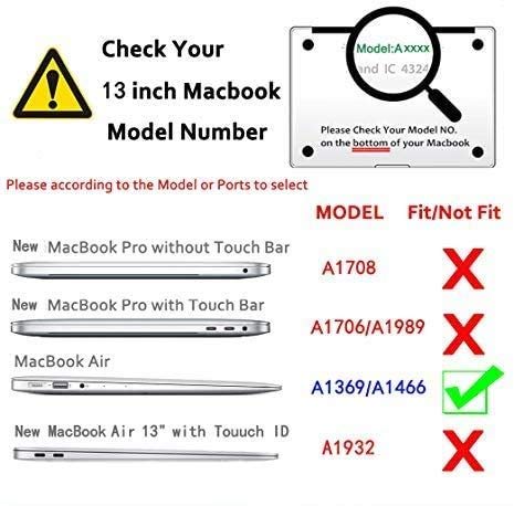 - ⚠️يرجى التحقق من طراز ماك بوك الخاص بك كما هو موضح في الصورة الثانية【التوافق】فقط للإصدار الأقدم من ماك بوك اير 13 انش موديل A1466 وA1369. إصدار 2017 / 2016 / 2015 / 2014 / 2013 / 2012 / 2011 / 2010. MQD32LL/A, MQD42LL/A, MMGF2LL/A, MMGG2LL/A, MJVE2LL/A, MJVG2LL/A, MD760LL/B, MD760LL/A, MD761LL/A, MD231LL/A, MD232LL/A, MC503LL/A, MC504LL/A, MC9 65LL/A، MC966LL/A.【 تحذير】هذا الغطاء غير متوافق مع طراز اللاب توب غير المذكور.