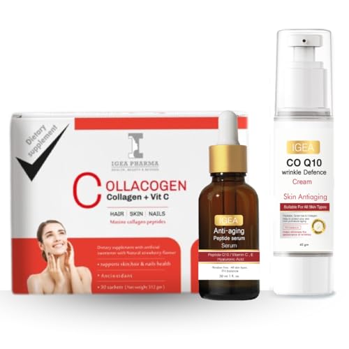- مجموعة متكاملة للعناية بالبشرة: تتميز المجموعة بتركيبة سيروم ببتيد 30 مل مع كريم حماية من التجاعيد CoQ10 وزن 40 جم ومكمل كولاجين مع فيتامين سي للعناية الشاملة ضد الشيخوخة.